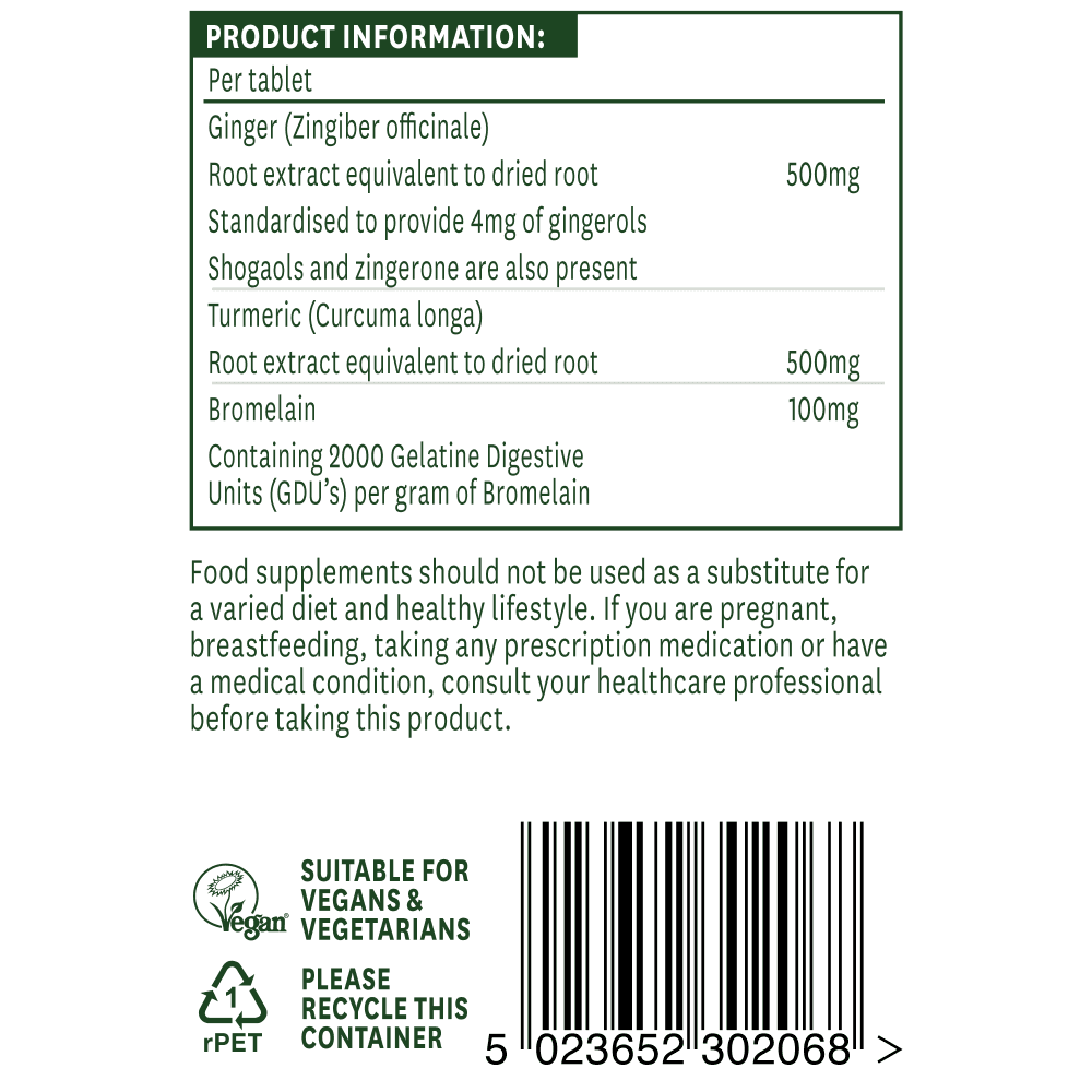 Our Ginger, Turmeric and Bromelain is a unique synergistic formula combining three remarkable botanical ingredients in one handy tablet. Our vegan friendly complex has been carefully crafted by our in-house nutritionists and is free from artificial colours, flavours and GM.