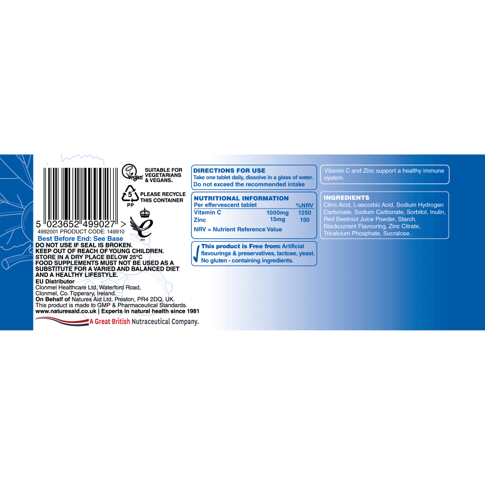 Each natural blackcurrant flavour tablet combines 1000mg Vitamin C with 15mg elemental Zinc; Vitamin C and Zinc support a healthy immune response.