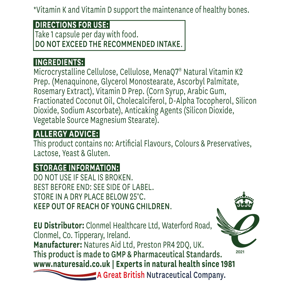 At Natures Aid, our Vitamin K2 has been carefully formulated by our in-house experts using a clinically validated and patented form of Vitamin K2 called MenaQ7.  MenaQ7 is vegan friendly, and free from gluten, dairy, soya and other common allergens.  It is also said to be the most bioactive form of Vitamin K2 on the market and has been used in many clinical trials investigating the potential benefits of this little know vitamin.